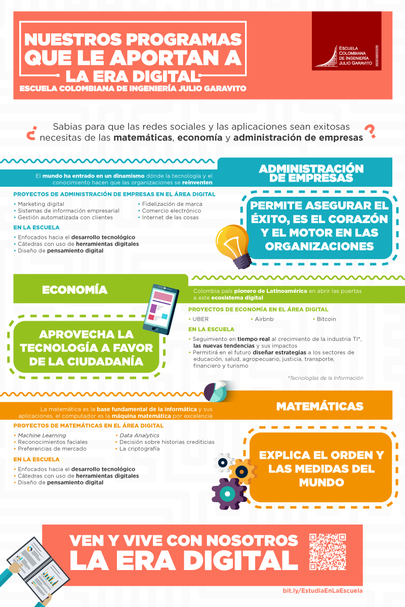Solo queda decirte, que si tienes la curiosidad y el entusiasmo la Escuela te apoya con sus excelentes profes, su campus natural que conecta a la creatividad y un costo de semestre que tú o yo podemos pagar, para que vivas la mejor etapa de tu vida en la Escuela Colombiana de Ingeniería Julio Garavito.