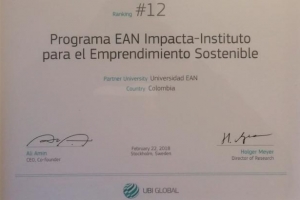El programa EAN Impacta, línea bandera del Instituto para el Emprendimiento Sostenible (IES) de la Universidad EAN, recibió un reconocimiento que lo posiciona como una de las mejores incubadoras universitarias del mundo y la más importante de Colombia. Nuestra comunidad universitaria y empresarial recibe con gran orgullo este nombramiento hecho por la UBI Global en la ceremonia de premiación del WorldIncubation Summit 2018 (WIS) realizada en Toronto (Canadá).