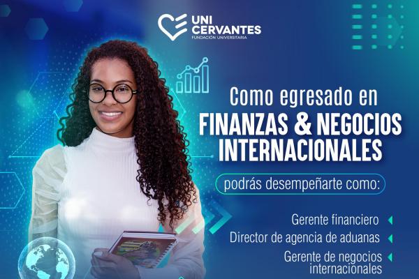 El profesional de Finanzas y Negocios Internacionales de UNICERVANTES debe ejercer la profesión con sentido crítico, sensibilidad humana y preceptos éticos para liderar procesos empresariales. Es un profesional con destrezas demostrables en inteligencia de negocios y toma de decisiones financieras, para mejorar la competitividad del sector productivo mediante la creación de valor y formulación de estrategias que aumenten el grado de satisfacción de clientes e inversionistas. Posee capacidad para intervenir en procesos empresariales con visión global de las áreas funcionales de la empresa y conocimiento profundo de los fenómenos financieros y de los negocios en el contexto nacional e internacional.