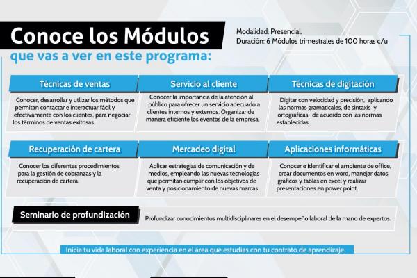 En este programa aprenderás sobre diversos ámbitos del oficio, desde el servicio al cliente, hasta la recuperación de cartera; pasando por técnicas de venta, mercadeo, manejo de cliente difícil, entre otras técnicas que le permitirán al estudiante entender las situaciones a las que se verá expuesto en su profesión y saber cómo afrontarlas desde el campo profesional.