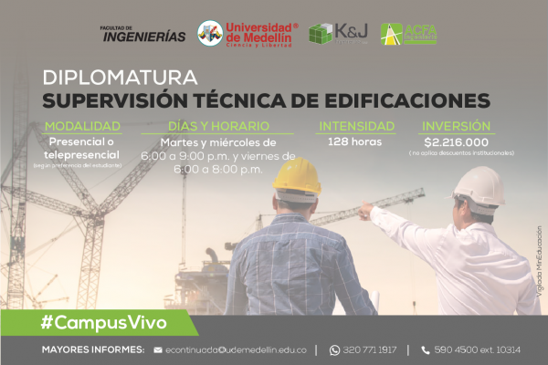 En Emagister, tenemos el objetivo de acercarte a alcanzar tus metas laborales, por tal motivo, en nuestro portal encontrarás los mejores diplomados de formación, impartidos por centros de alta calidad que cumplen con los estándares de educación. En esta ocasión la Universidad de Medellín, quiere invitarte a ser parte de su innovador Diplomado en Supervisión Técnica de Edificaciones