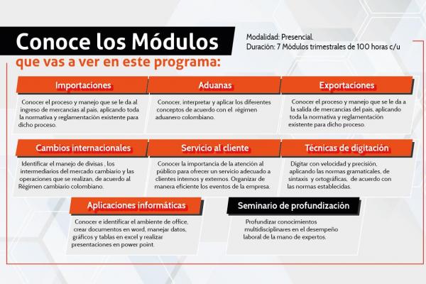 El programa técnico laboral en Comercio Exterior tiene una modalidad presencial y una duración de 7 módulos trimestrales, los cuales se exponen a continuación: