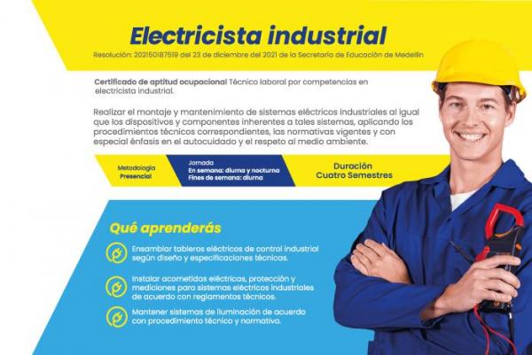 El programa de Técnico laboral en electricista industrial otorga certificado de aptitud ocupacional como técnico laboral por competencias en electricista industrial. Duración: (1.100 horas) cuatro semestres, tres de formación laboral y uno de práctica empresarial